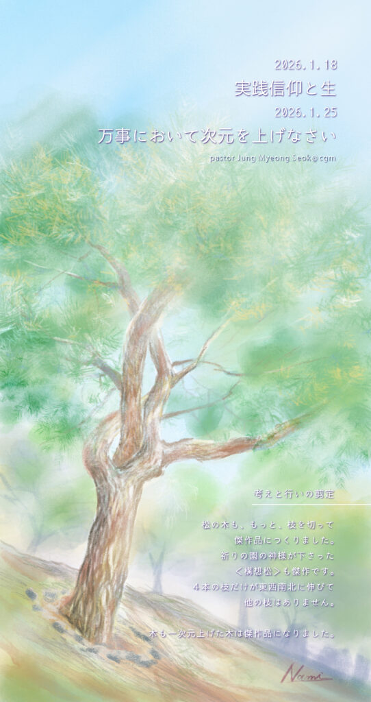 主題 2026.1.25万事において次元を上げなさい 2026年1月25日 / 盆栽の松の木もほとんど60%以上切って初めて作品になるのだそう。そのように、自分の生活の中も、いらない考えやいらない行いが多く多いんだろうなあと思いました。比喩が絶妙です。とりあえず、部屋の掃除をしよう!笑